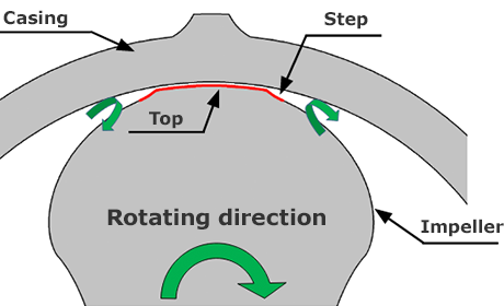The tip of the impeller, called a top, and the inner periphery of the casing are configured to form together a face seal. The step generates currents swirling against the flow of the gas, which goes against the rotation direction of the rotor, to decrease the internal leakage amount. This achieves a high operating-efficiency and an effect of energy-saving.