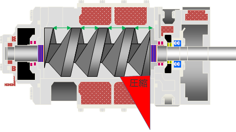 スクリュー式は、吸気から排気までを非接触状態で単段圧縮を行うことにより、空気やガスなどの気体に同伴するパウダー分やミスト分などを効率良く排気する特徴を有しており、半導体、液晶、太陽電池、医薬、ケミカル業界などの幅広い真空用途で高信頼性のポンプとして採用されています。